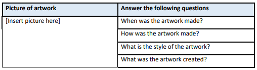 Complete the below table for each artwork, including pictures of these artworks. For each of the artworks explain: when it was made; how it was made; what is the style of the work; and why was it created. Total of three (3) tables.