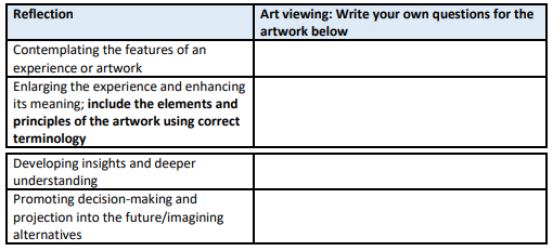 · Read Chalk & Dinham (2018), pp.114- 119. Following Table 5.1 on page 116, complete a table with your own questions for each of the three (3) artworks. Total of three (3) tables.